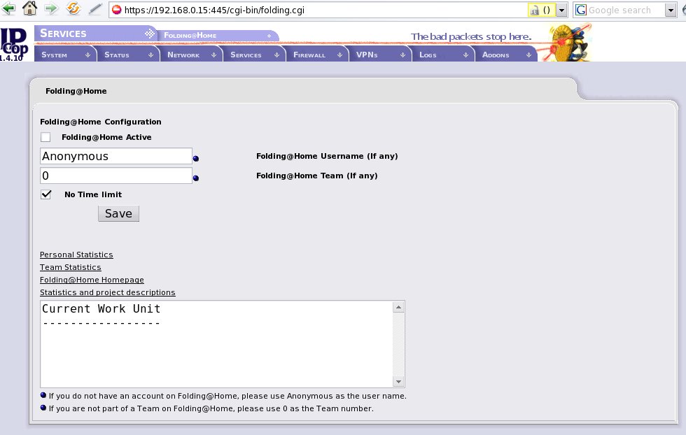 Enter the group you would to be a part of, if none use 0 Use the "No Time Limit" on slower machines, as Folding@Home requires a lot of CPU cycles to fold a protein. When starting FAH, it may take some time to start, and progress may be slow due to load on your IPCop, and the speed of the CPU and memory. |